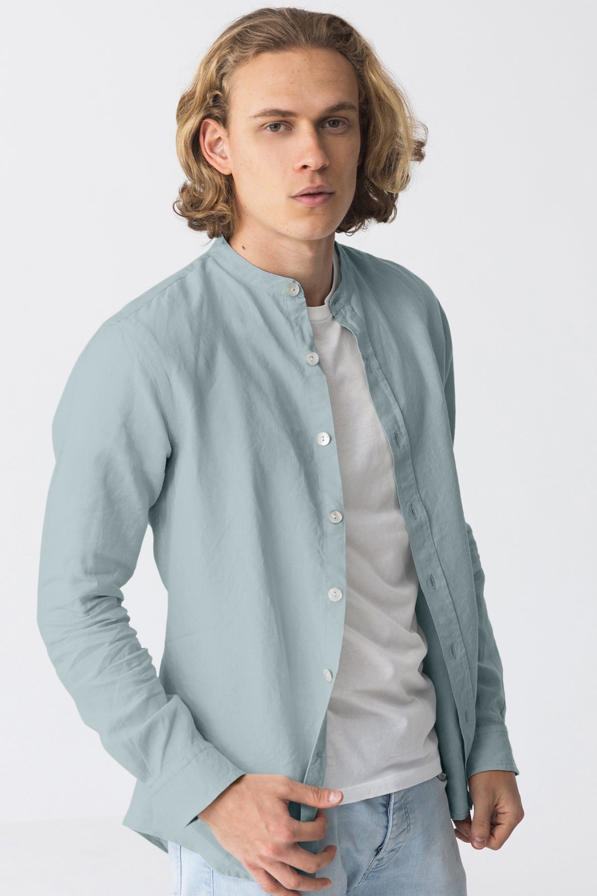 Mandarin collar linen shirt icy blue - Natanael
