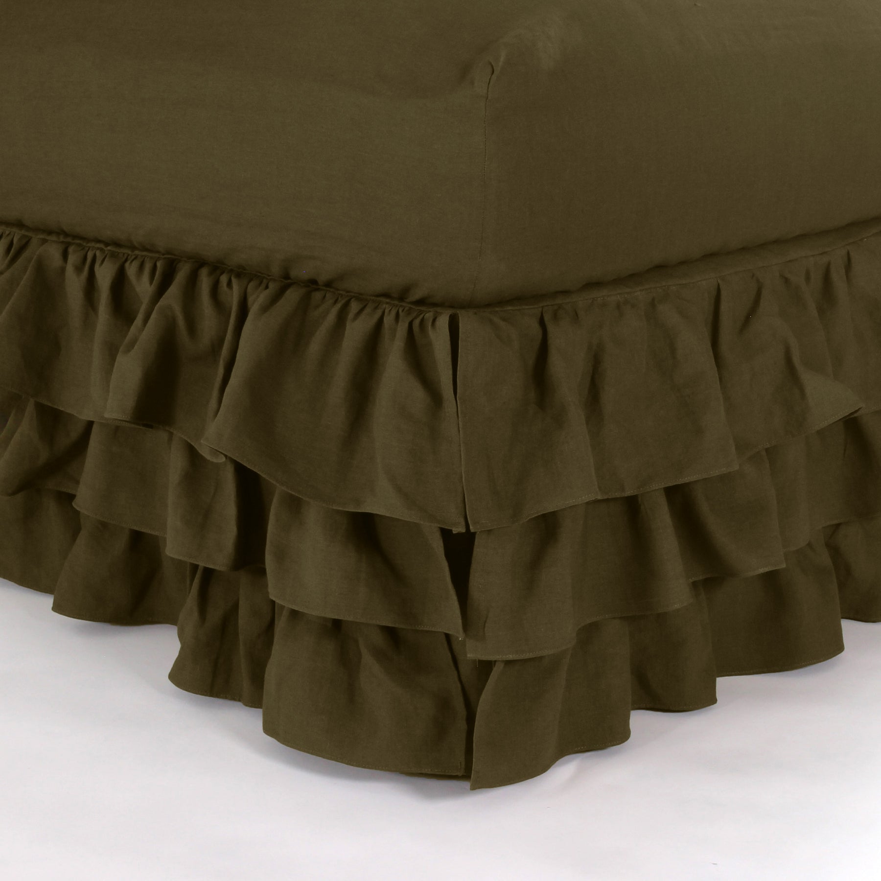 Transform your bedroom into a cozy and charming place by decorating your bed with this "Waterfall" linen bed skirt. It will add sophistication to your bed and invite you to relax. This valance-style bed skirt is made of pure linen with three rows of ruffles. The two split corners can fit a canopy. The box spring is covered on three sides. Its height is customizable from 15 cm up to 61 cm from our menu. You just have to make the request and we can adapt your order if the desired size is not on the menu and thus make your bed base cover to measure and on 4 sides. Also available for electric beds.